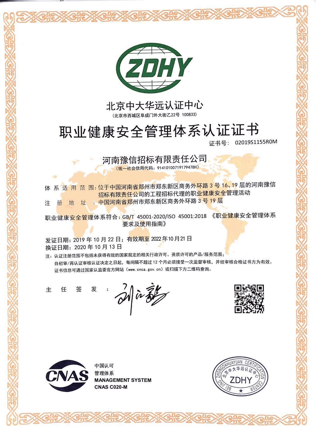 職業(yè)健康安全管理體系認(rèn)證證書 -