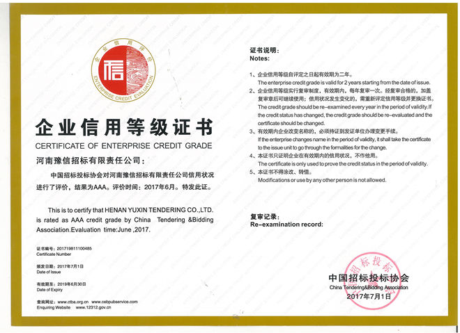 中國招投標(biāo)協(xié)會(huì)3A企業(yè)信用等級(jí)證書