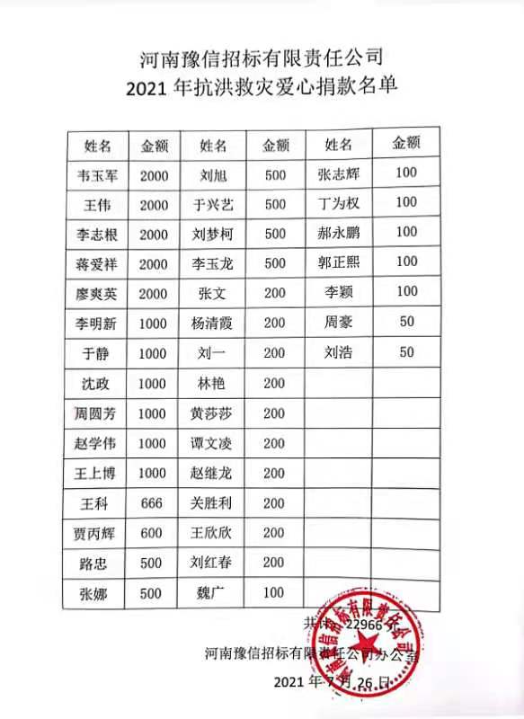 抗洪救災(zāi)愛心捐款倡議書發(fā)出后 , 我公司員工積極響應(yīng),踴躍捐款,共計募集善款 22966 元,全部捐贈于河南省紅十字基金會;同時,公司員工通過其他途徑自發(fā)捐贈的善款與物資合計約 12000 元,也在第一時間送往災(zāi)區(qū)。