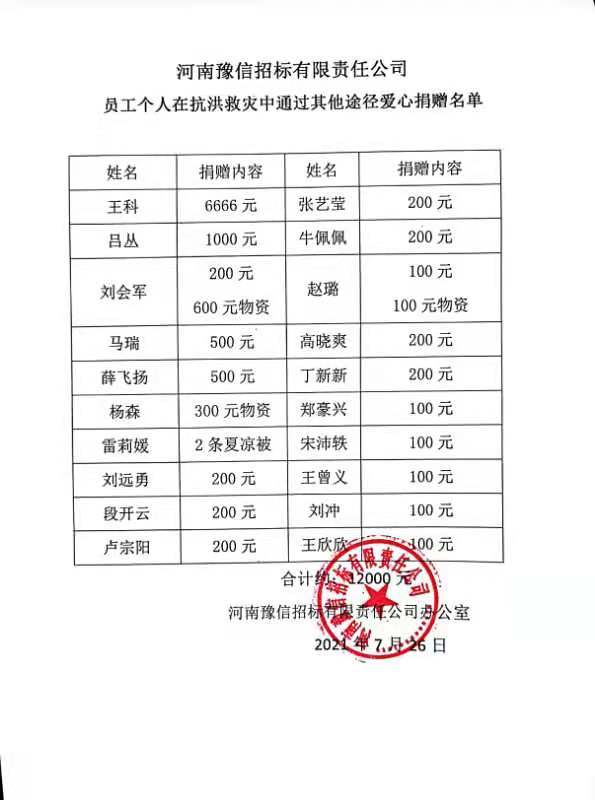 受超強降雨影響,目前河南省內(nèi)抗洪救災(zāi)仍在繼續(xù)!我省仍有多地汛情嚴峻,身為河南本土國有企業(yè),河南豫信招標有限責(zé)任公司 號召 公司干部職工 以實際行動幫助災(zāi)區(qū)人民抗洪救災(zāi)、重建家園 。