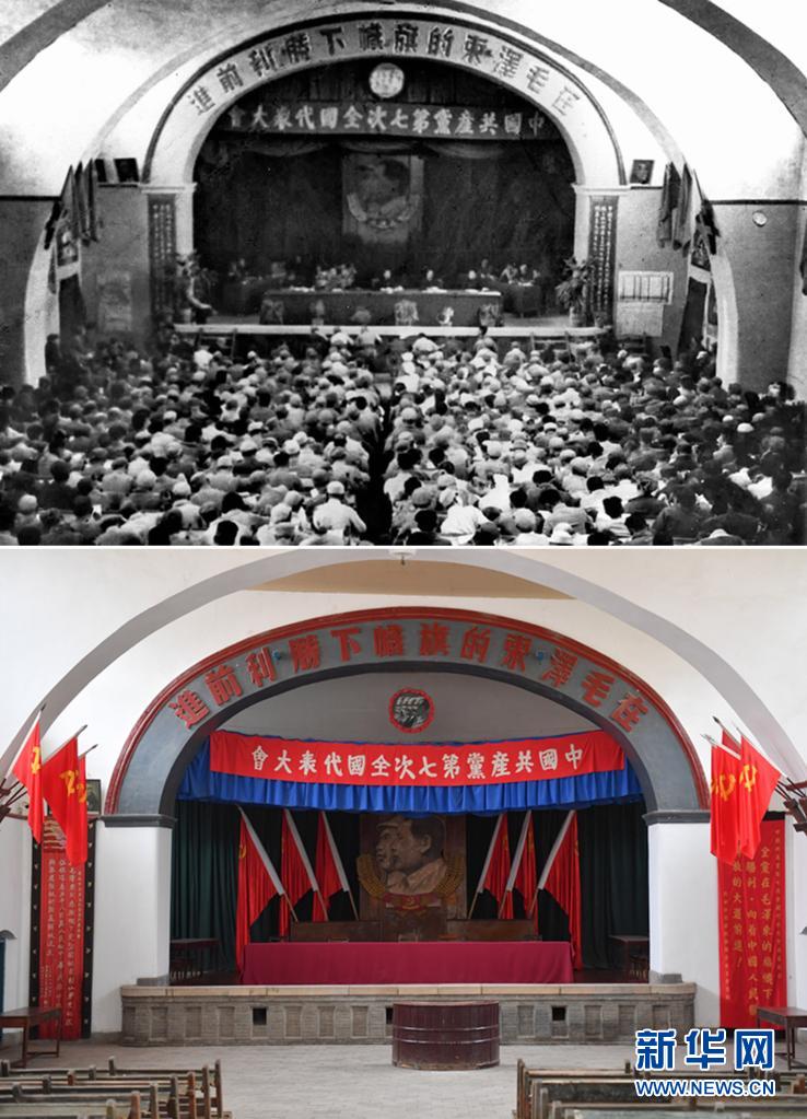 這是一張拼版照片,上圖為:中國共產(chǎn)黨“七大”會場(資料照片,新華社發(fā));下圖為:2021年3月31日拍攝的位于延安市楊家?guī)X革命舊址的中國共產(chǎn)黨“七大”會場(新華社記者張博文攝)。新華社發(fā)