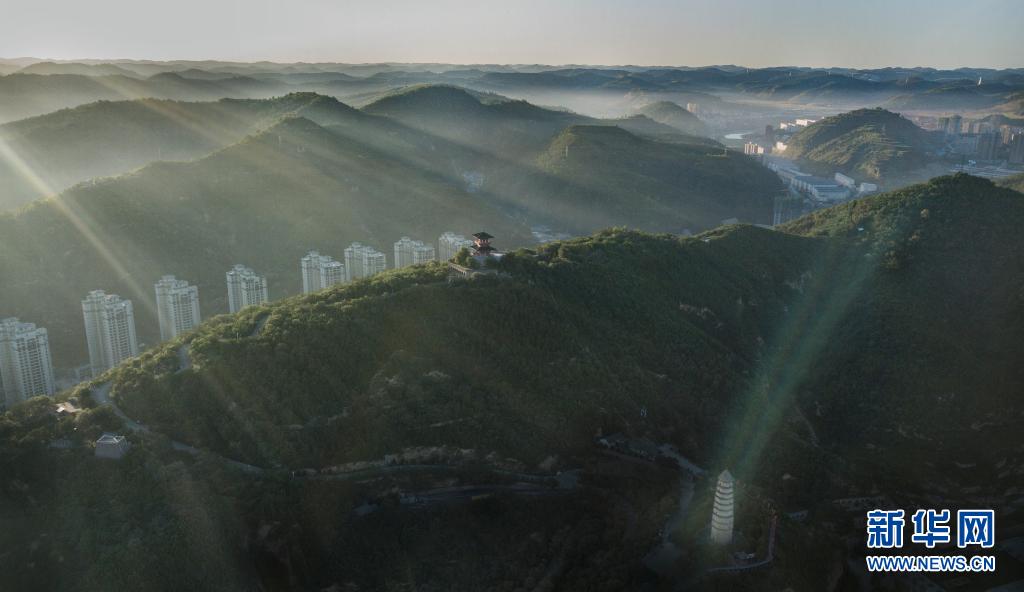 這是2019年8月29日拍攝的被綠色環(huán)繞的陜西省延安市寶塔山(無人機(jī)照片)。新華社記者 陶明 攝