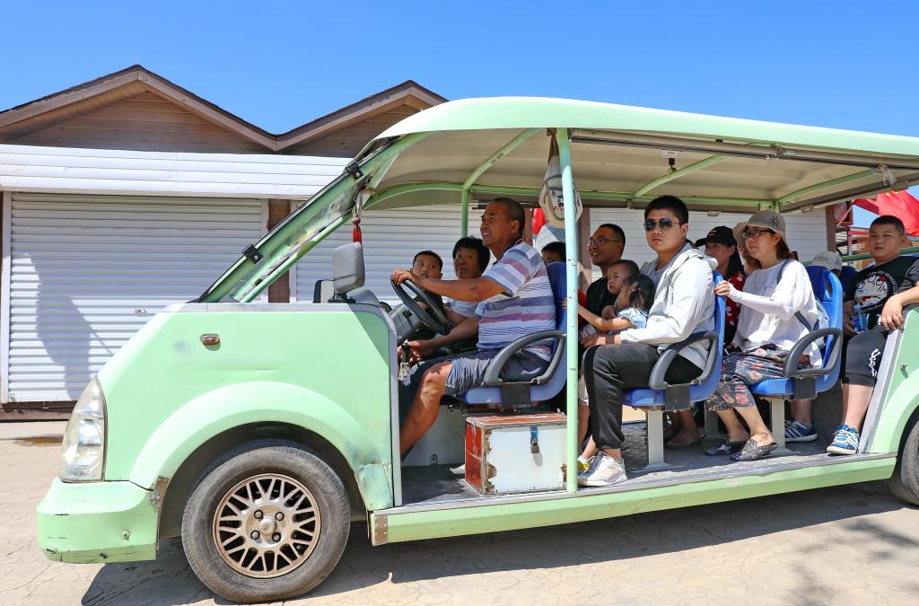 在西柏坡,村民駕駛電動(dòng)車(chē)帶領(lǐng)乘客觀光游覽(2019年8月16日攝)。新華社記者楊世堯攝