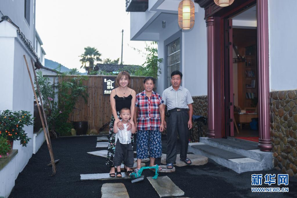 2017年8月9日,在浙江省淳安縣楓樹(shù)嶺鎮(zhèn)下姜村,村民姜麗娟(左一)與父親姜北方(右一)、母親王洋球(中)及兒子安安在自家開(kāi)辦的“棲舍”民宿院內(nèi)合影。新華社記者 黃宗治 攝