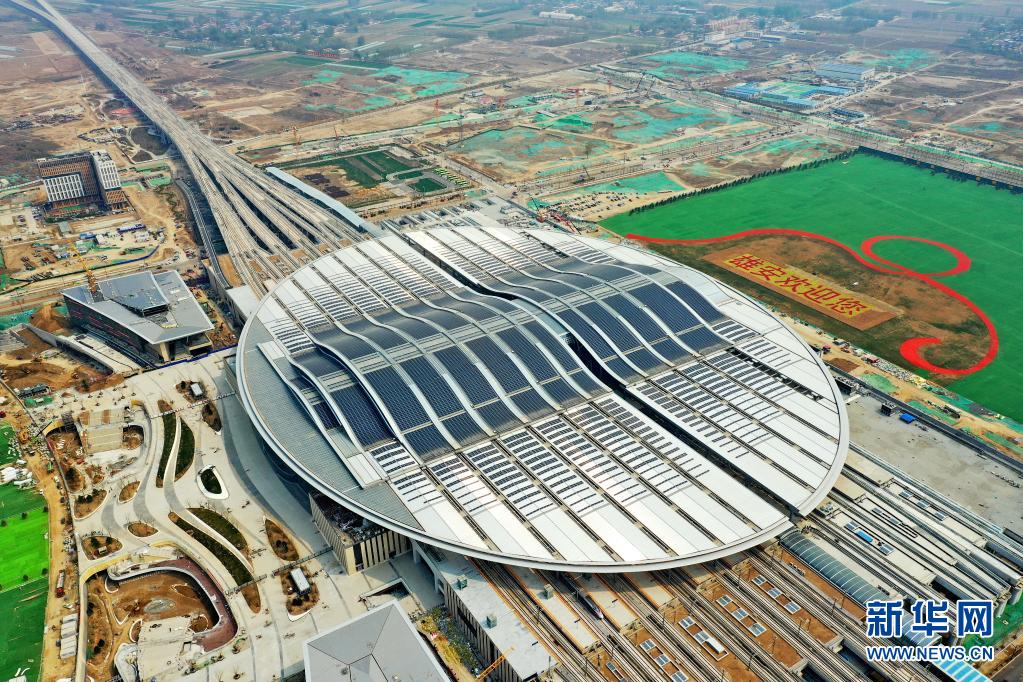 這是4月9日拍攝的京雄城際鐵路雄安站(無(wú)人機(jī)照片)。新華社記者 牟宇 攝