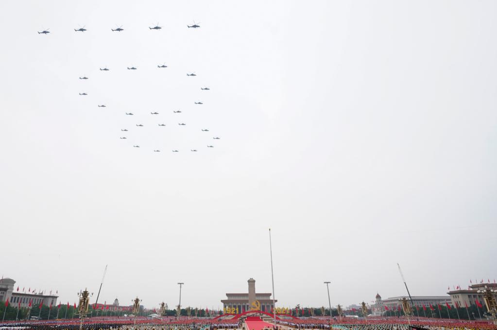 2021年7月1日上午,慶祝中國(guó)共產(chǎn)黨成立100周年大會(huì)在北京天安門廣場(chǎng)隆重舉行。這是大會(huì)開始前的飛行慶祝表演(2021年7月1日攝)。新華社記者 高潔 攝