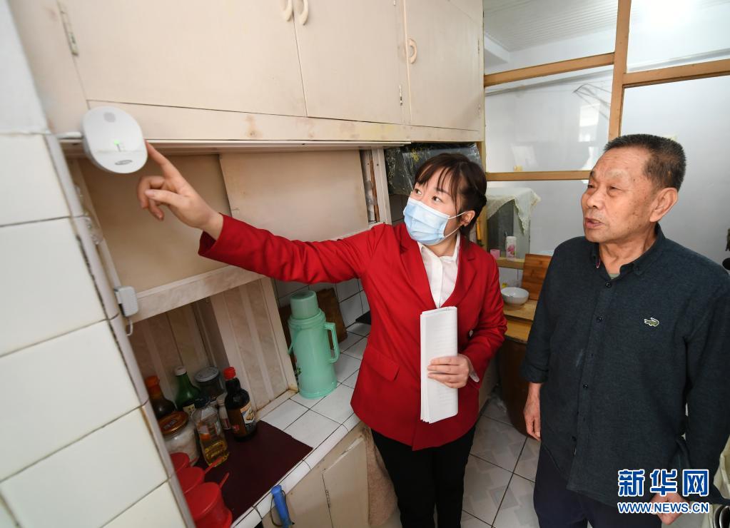 吉林省長春市長山花園社區(qū)黨委書記韓麗萍(左)到獨居老人家中檢查燃氣報警設備(資料照片)。新華社發(fā)