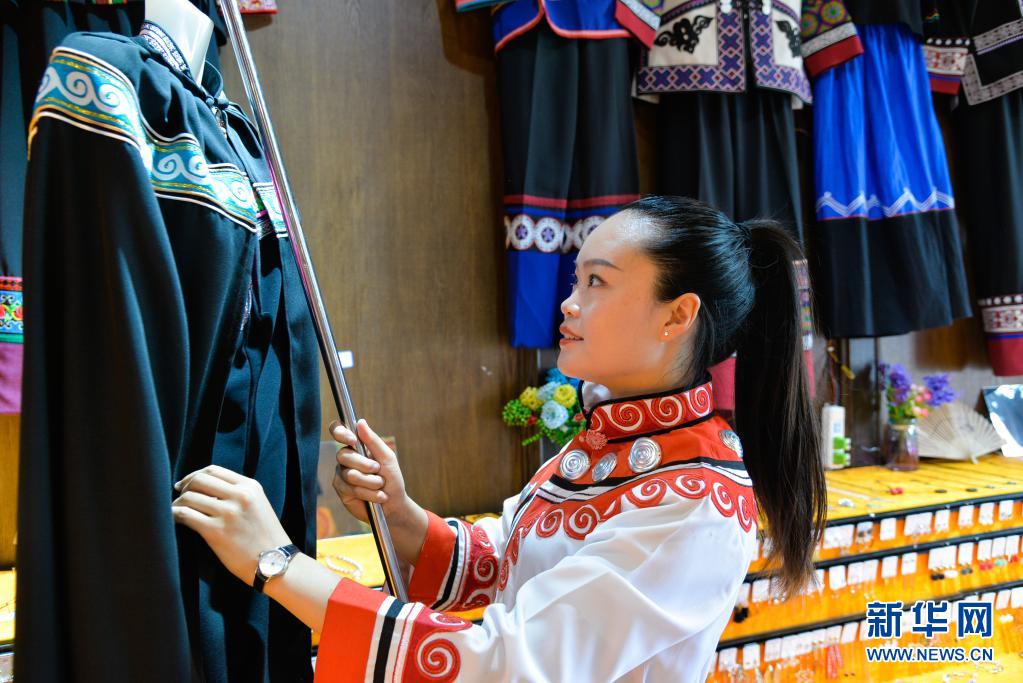 7月15日,在貴州省畢節(jié)市大方縣奢香古鎮(zhèn),彝族姑娘龍恩碧在自己的彝族服飾和手工藝品店整理商品。新華社記者 徐欽 攝