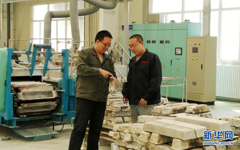 在內蒙古包頭稀土研究院,科研人員胡文鑫(左)和同事分析合金斷面(資料照片)。新華社發(fā)