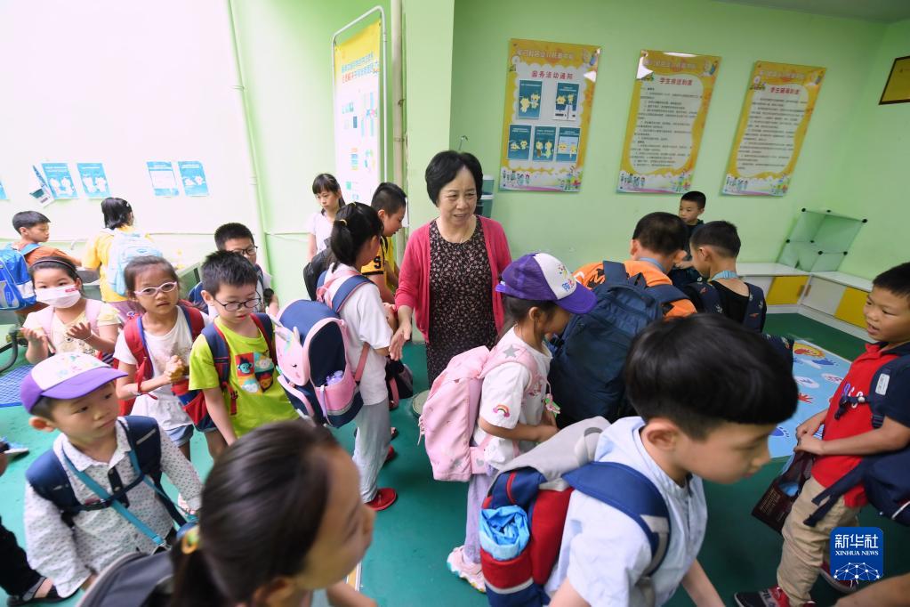 福建省福州市鼓樓區(qū)東街街道軍門社區(qū)黨委書記林丹來到軍門社區(qū)“陽光朵朵”少兒托管中心看望放學后在這里托管的小朋友(6月23日攝)。新華社記者 林善傳 攝