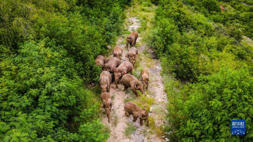 這是8月9日在云南省玉溪市元江縣境內拍攝的象群(無人機照片)。新華社記者 胡超 攝