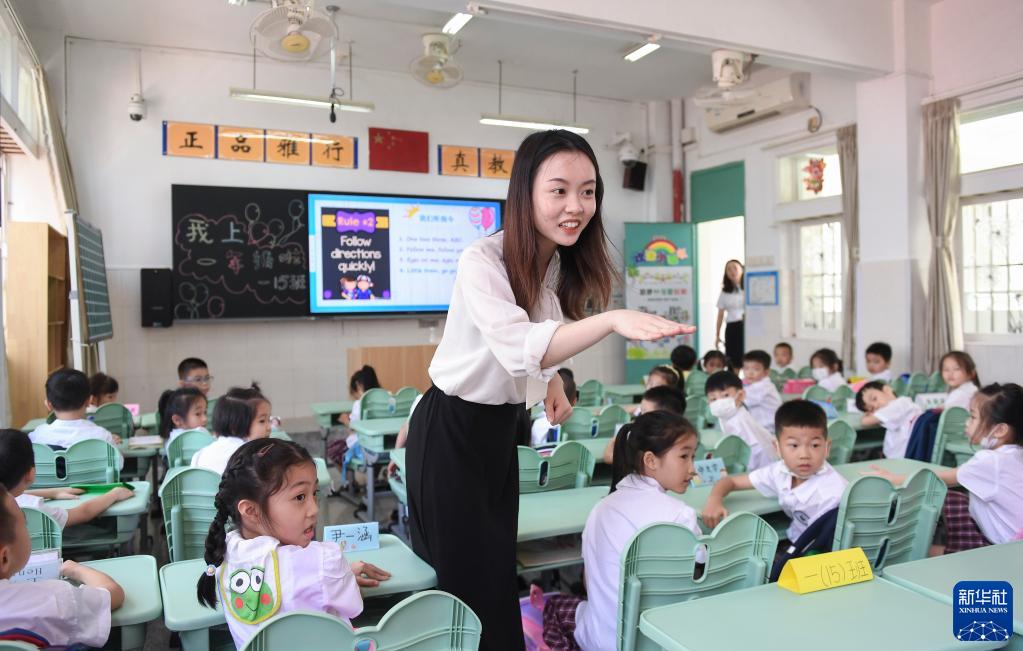 深圳市福田區(qū)南園小學(xué)教師、香港理工大學(xué)對(duì)外漢語(yǔ)教育專(zhuān)業(yè)碩士畢業(yè)的香港青年黃曉蕾在英語(yǔ)課上與孩子們互動(dòng)(9月1日攝)。新華社記者 毛思倩 攝