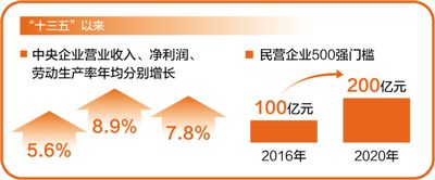 國(guó)企規(guī)模實(shí)力持續(xù)增強(qiáng),效益穩(wěn)步提高。預(yù)計(jì)到今年底,中央企業(yè)資產(chǎn)總額將接近69萬(wàn)億元,比“十二五”末增長(zhǎng)45%。“十三五”以來,中央企業(yè)營(yíng)業(yè)收入、凈利潤(rùn)、勞動(dòng)生產(chǎn)率年均分別增長(zhǎng)5.6%、8.9%、7.8%,進(jìn)入世界500強(qiáng)的中央企業(yè)達(dá)到48家。民企改革發(fā)展成效顯著。“十三五”以來,民營(yíng)企業(yè)500強(qiáng)門檻從2016年的100億元提升至2020年的200億元;創(chuàng)新創(chuàng)業(yè)創(chuàng)造熱情高漲,中小企業(yè)數(shù)量增長(zhǎng)近1倍。