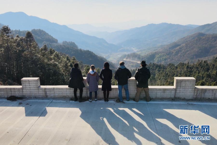 新華社記者繆曉娟和植國明、肖恩、瑞貝卡·尼什、烏俊杰在山間觀景(2020年12月20日攝,無人機(jī)照片)。新華社記者 陳諾攝