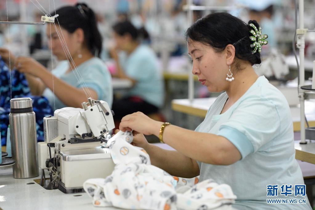 在新疆和田地區(qū)和田縣布扎克鄉(xiāng)思源扶貧產(chǎn)業(yè)園,工人在制作服裝(2019年8月31日攝)。新華社記者 丁磊 攝