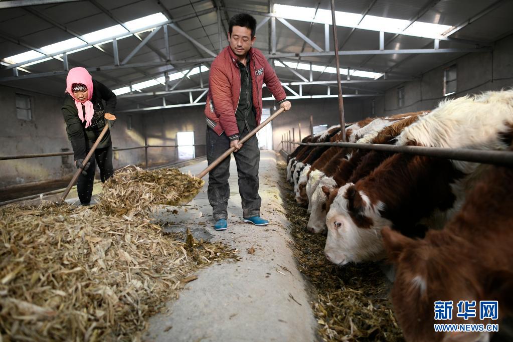 寧夏吳忠市同心縣河西鎮(zhèn)旱天嶺村村民馬國才(右)、馬婷夫婦在村里的養(yǎng)牛合作社喂牛(2017年12月21日攝)。新華社記者 王鵬 攝