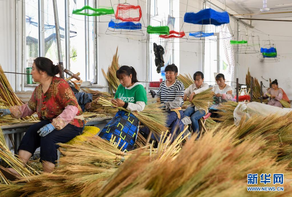 婦女在內(nèi)蒙古巴林左旗林東鎮(zhèn)扶貧車間內(nèi)制作笤帚(2019年8月5日攝)。新華社記者 彭源 攝