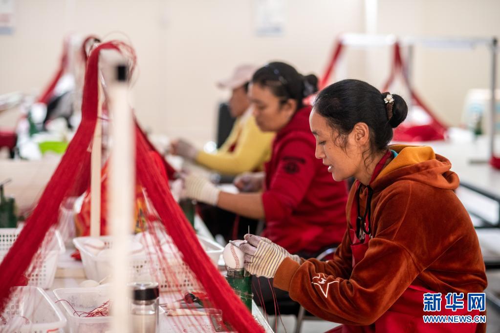 在云南省怒江傈僳族自治州福貢縣匹河鄉(xiāng)托坪村搬遷安置點,搬遷群眾在扶貧車間縫制棒球(2020年11月2日攝)。新華社記者 胡超 攝