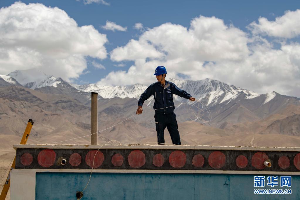 在新疆喀什地區(qū)塔什庫爾干塔吉克自治縣,工作人員為當?shù)剞r(nóng)戶鋪設(shè)入戶光纖(2020年6月10日攝)。新華社記者 胡虎虎 攝