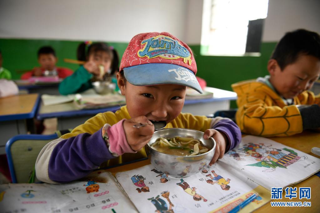 寧夏西吉縣震湖鄉(xiāng)陳岔小學的孩子在教室吃午餐,學生每天在學校有兩頓國家提供補助的營養(yǎng)餐(2017年6月14日攝)。新華社記者 王鵬 攝