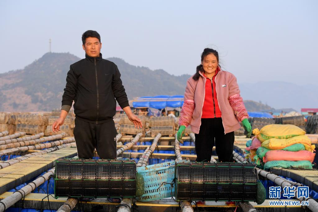 “春運母親”巴木玉布木與丈夫巫其石且從四川涼山彝族自治州老家輾轉(zhuǎn)來到福建省霞浦縣溪南鎮(zhèn)海域,從事海上漁排海參養(yǎng)殖。這是2月4日在漁排上拍攝的巴木玉布木(右)與丈夫巫其石且。新華社記者 姜克紅 攝