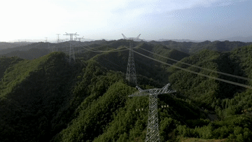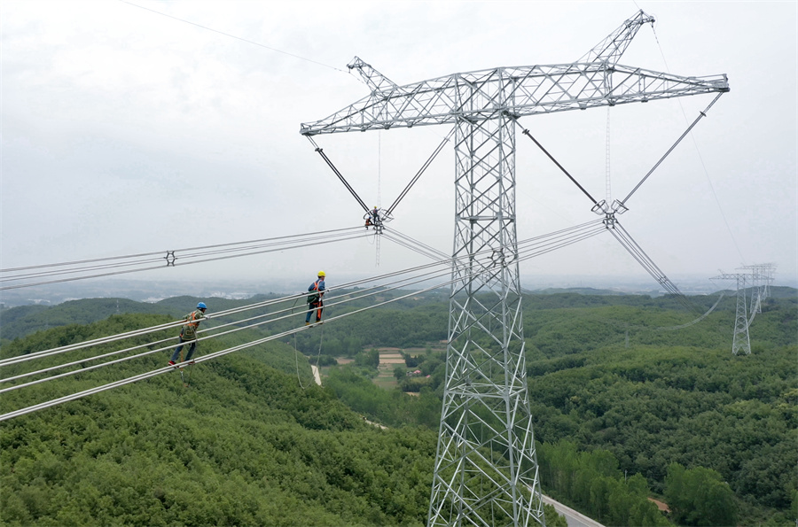 ??國網(wǎng)河南省電力公司員工在±800千伏青豫特高壓工程西陜段進行線路檢修。