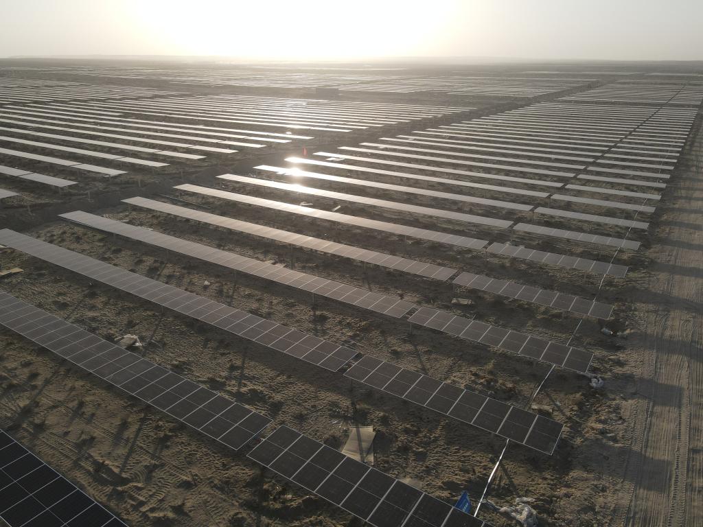 在烏茲別克斯坦卡什卡達里亞州和布哈拉州遼闊的大漠荒原上,太陽能光伏板列隊排布,在陽光映射下發(fā)出耀眼光芒。