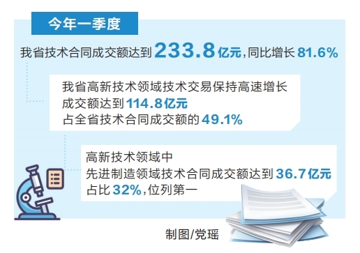 ??4月7日,記者從省科技廳獲悉,今年一季度,我省技術(shù)合同成交額達(dá)到233.8億元,同比增長(zhǎng)81.6%。