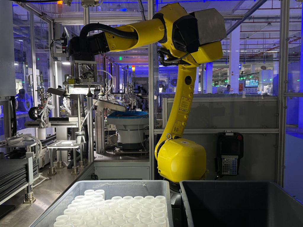 ??南安一家衛(wèi)浴企業(yè)生產(chǎn)線上,機(jī)械臂正在抓取過(guò)濾器零件。新華社記者 龐夢(mèng)霞 攝