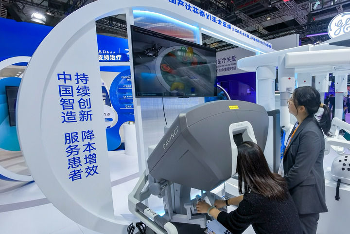 ??11月8日,一名參觀者(左)在第七屆進博會醫(yī)療器械及醫(yī)藥保健展區(qū)復(fù)星醫(yī)藥展臺體驗操作一款外科手術(shù)機器人。新華社記者 張鋮 攝