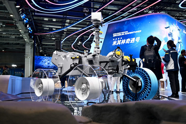 ??這是11月6日在第七屆進博會汽車展區(qū)拍攝的在亞洲首次亮相的米其林月球探測車輪胎。新華社發(fā)(陳浩明 攝)