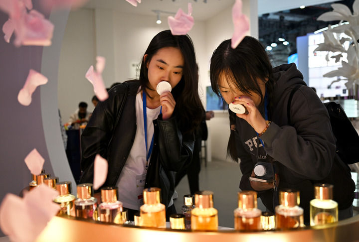 ??11月9日,觀眾在第七屆進博會歐萊雅展臺試聞香水。新華社發(fā)(陳浩明 攝)