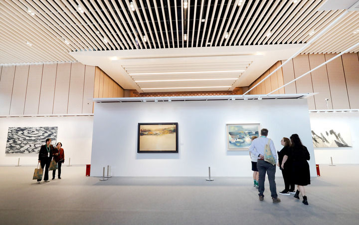??11月9日,觀眾在第七屆進博會國際現(xiàn)當代藝術(shù)專區(qū)觀看繪畫藝術(shù)展品。新華社記者 方喆 攝